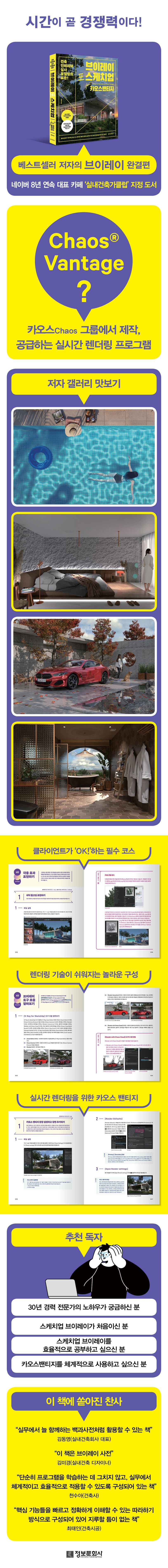 경력 30년 이상 건축 디자이너인 저자가 실무에서 누구라도 이 책을 백과사전처럼 활용할 수 있도록 브이레이의 핵심 기능을 선별했다. 반사, 굴절, 범프 등의 각종 재질감부터 실무 예제 그리고 Lights, Utillities, Objects 등의 도구 모음과 Settings, Generic 등의 각종 옵션 창까지 내용을 꼼꼼하게 구성했다. 또한 국내에 아직 관련 서적이 출간된 적 없는, 실시간 렌더링 프로그램인 ‘카오스 밴티지’의 설치부터 사용 방법을 특히 실무 활용에 중점을 두어 설명했다. 그리고 본문 곳곳에 있는 ‘현장 플러스’로 저자의 노하우를 자연스럽게 습득할 수도 있다.