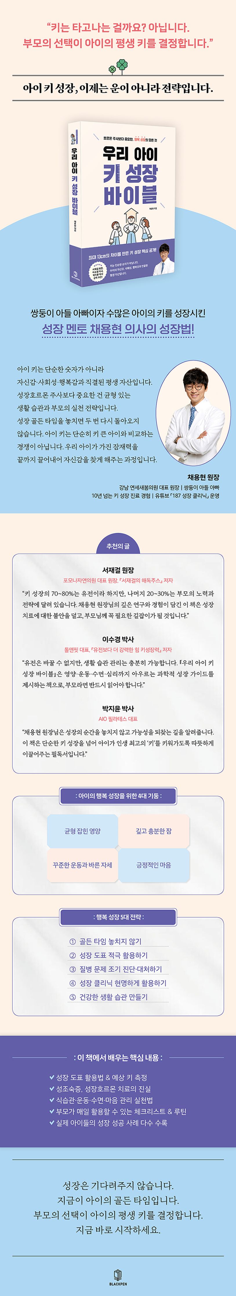 『우리 아이 키 성장 바이블』은 아이 본연의 성장 리듬을 존중하는 현명한 키 성장법을 알려주는 책이다. 이 책의 저자인 채용현 의사는 지난 10여 년간 자신의 병원인 강남 연세새봄의원에서 수많은 아이와 부모를 만나며 아이들의 성장 고민을 해결해왔다. 아이의 숨은 키를 찾아내는 것을 넘어, 균형 잡힌 발달과 몸과 마음의 전반적인 건강을 완성하는 것을 목표로 하기에 국내외 수많은 가정이 그를 ‘믿고 따라가는 성장 멘토’라 부른다. 의사로서의 수많은 임상 경험과 쌍둥이 아이의 아빠로서의 진솔한 마음을 담아 아이에게 맞는 최적의 성장 로드맵을 제안한다.