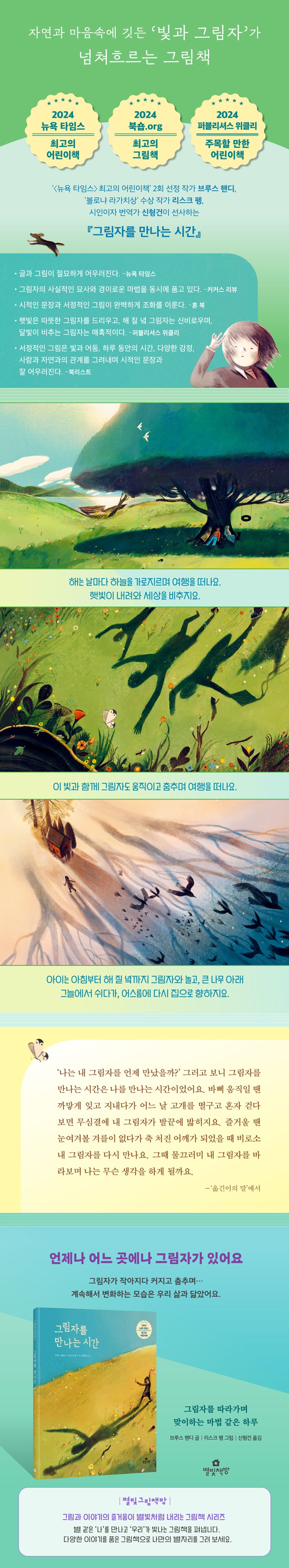 현재 미국 어린이 출판계에서 주목받고 있는 두 작가와, 번역 그림책과 동시집을 내며 꾸준히 활동하고 있는 신형건 시인의 만남은, 우리가 ‘그림자’로 상상하고 경험할 수 있는 거의 모든 것들을 발견할 수 있도록 도와준다.