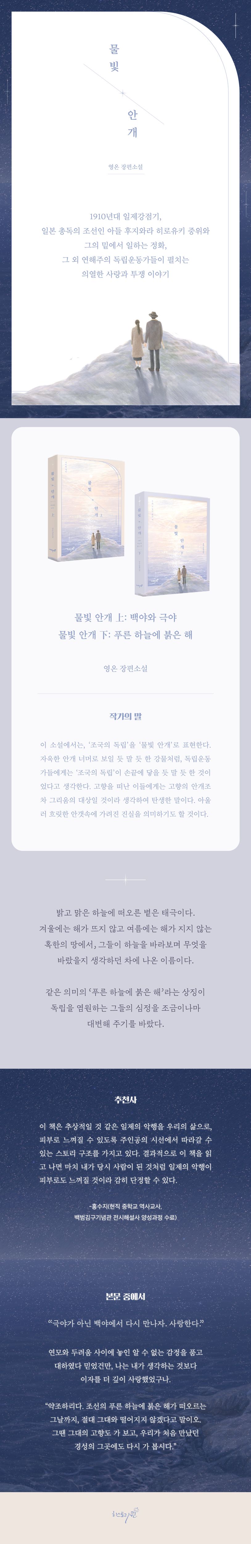 소설은 가공의 인물인 정화와 히로유키뿐 아니라, 여성 독립운동가들을 모티브로 삼은 윤관 영과 최자현, 연해주에서 실제로 활동했던 최재형, 김이직, 이범윤, 엄주필, 최성학, 이상설, 이인순, 정창빈, 김마리아 등이 ‘물빛 안개’처럼 닿을 듯 말 듯 한 독립을 목적으로, 일제의 탄압에 맞서 무장 투쟁을 벌이는 과정을 밀도 있게 다룬다. 머나먼 타국에서 태극기를 펼치 기를 소망했던 순국선열들의 투지를 다룬 소설을 읽으면, 우리도 푸른 하늘에 붉은 해가 떠 오르기를 바랄 것이다.