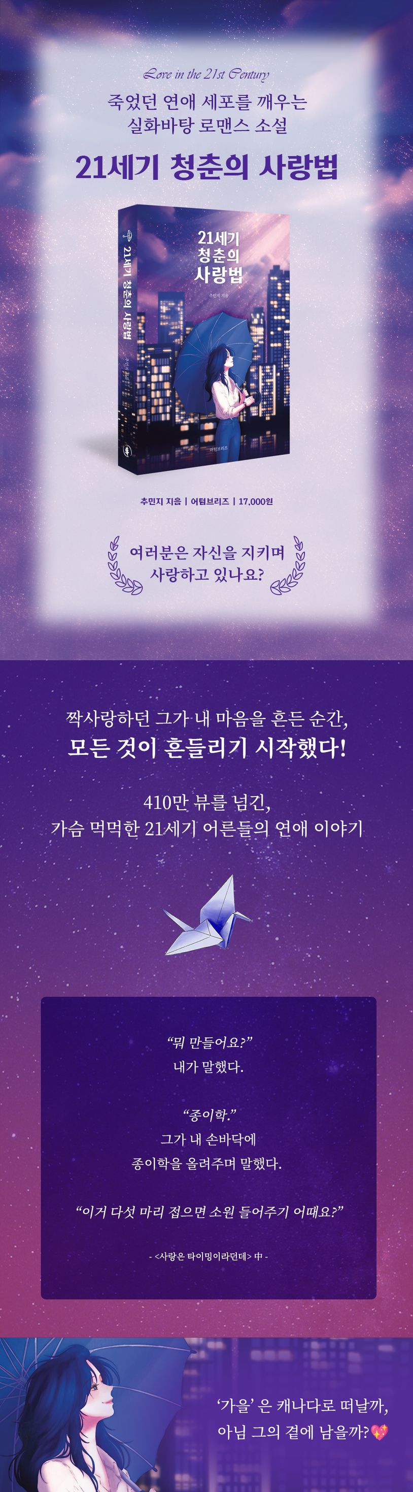 꿈을 위해 사랑을 포기해야 할지, 사랑을 위해 모든 걸 걸어야 할지, 누구나 한 번쯤 고민했을 선택의 순간을 섬세하게 담아낸다. '21세기를 살아가는 청춘의 불안함과 사랑'이라는 주제를 진솔하게 풀어낸 이 소설은 누구나 공감할 수 있는 현실적인 사랑 이야기로 깊은 여운을 남긴다.