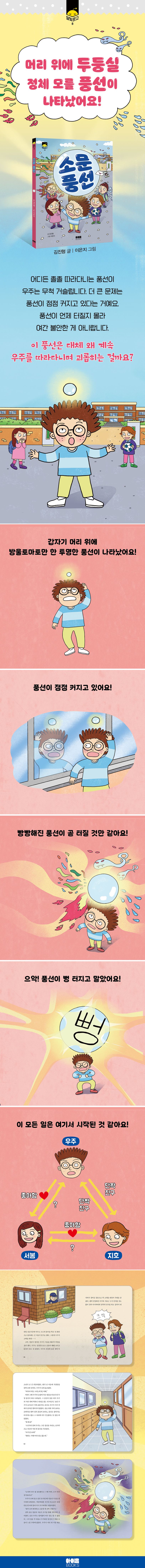그런데 이게 무슨 일일까? 우주의 머리 위에 갑자기 조그맣고 투명한 풍선이 둥둥 떠오르더니 우주를 졸졸 따라다닌다. 소문이 부풀수록, 친구들 사이에 더 널리 퍼질수록 풍선도 덩달아 빵빵해진다. 소문이 자꾸 퍼지는 것도 찝찝하고 심란한 마당에 풍선까지 점점 부풀어 오르니, 우주는 속수무책 도무지 대책이 서지 않는다. 풍선은 왜 우주를 따라다니며 괴롭히는 걸까? 일파만파로 번져 가는 이 상황을 어떻게 바로잡아야 할까?