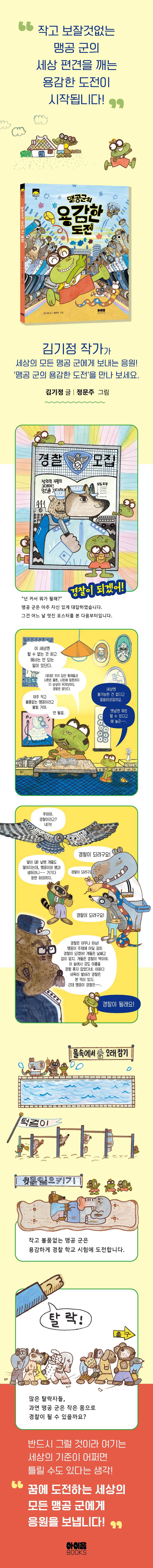 술술 읽히는 매력적인 문장에 유머와 기발함이 더해져, 작고 보잘것없지만 놀라울 만큼 용감한 주인공 맹공 군이 탄생했다. 주인공 맹공 군은 몹시 작은 맹꽁이지만, 누구도 예상치 못한 꿈을 갖는다. 바로 경찰이 되는 것! 아빠는 맹꽁이 집안에선 있을 수 없는, ‘불가능한 일’이라고 하지만, 맹공 군은 물러서지 않는다. 경찰 학교 시험을 위해 길을 떠난 맹공 군이 매와 들쥐 영감, 아기 새와 만나면서 펼쳐지는 에피소드 속에서 독자는 작은 맹공 군이 품은 꿈에 대한 마음을 자연스럽게 만나게 된다.