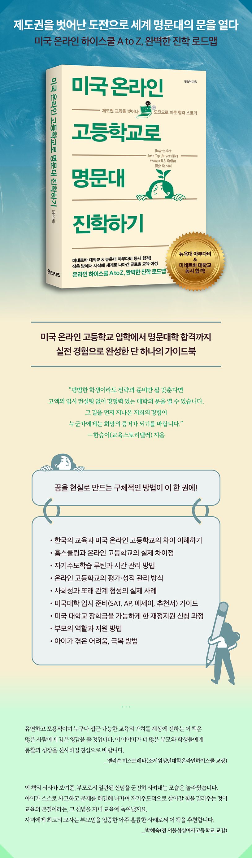 온라인 고등학교의 실체와 입시 준비 과정을 부모의 시선으로 세밀하게 풀어낸 이 책에는 미국 주요 온라인 학교의 커리큘럼, 학점 관리, AP·SAT 대비법, 포트폴리오 전략 등 구체적인 노하우가 담겨 있다. 특히 고액의 입시 컨설팅 없이 정보 탐색과 자기주도학습만으로 명문대 합격을 이룬 과정을 상세히 기록하여, ‘온라인 교육은 대안’이라는 편견을 넘어 자기주도형 학습이 글로벌 대학 입시의 핵심 역량임을 입증해 보인다.