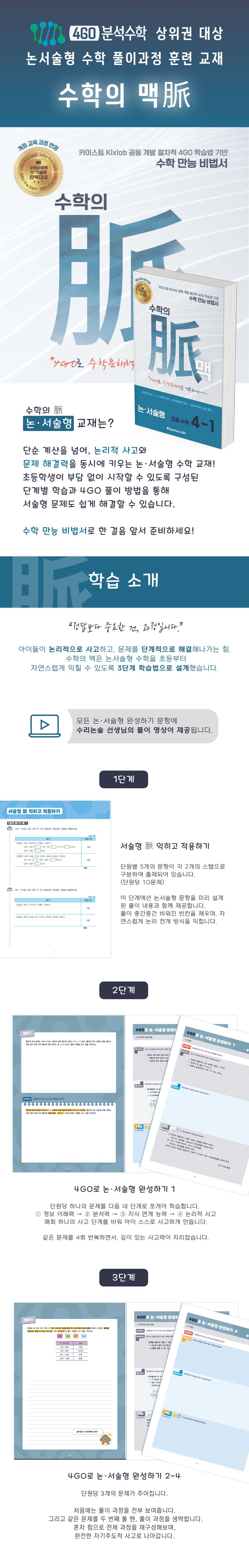 수학의 맥 논·서술형 교재는 4GO분석수학의 상위권 대상 논서술형 수학 풀이과정 훈련 교재로 개발되었습니다.