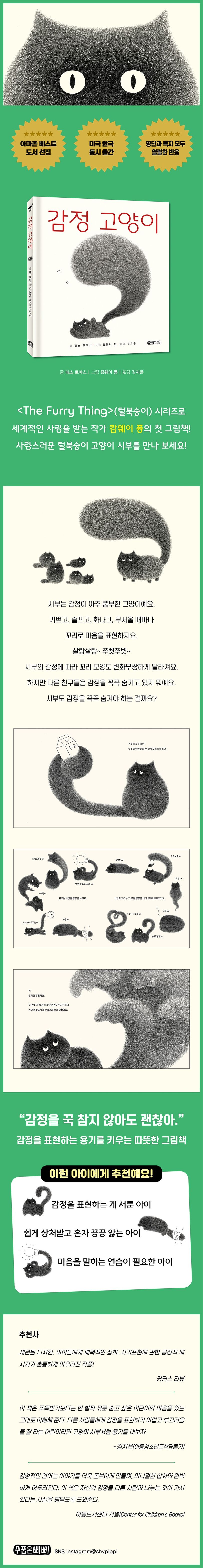 이 책 《감정 고양이》는 작가가 지금까지 작업했던 사랑스러운 털북숭이들이 그림책으로 탄생한 첫 작품이다. 다양한 감정을 솔직하게 느끼고 표현하는 고양이 ‘시부’의 이야기를 따뜻하고 섬세하게 그려낸 책으로, 꼬리로 모든 감정을 표현하는 고양이 시부를 통해 수줍음 많고 감정 표현이 서툰 아이들이 자기 감정을 솔직하게 표현할 수 있는 용기를 얻을 수 있을 것이다.