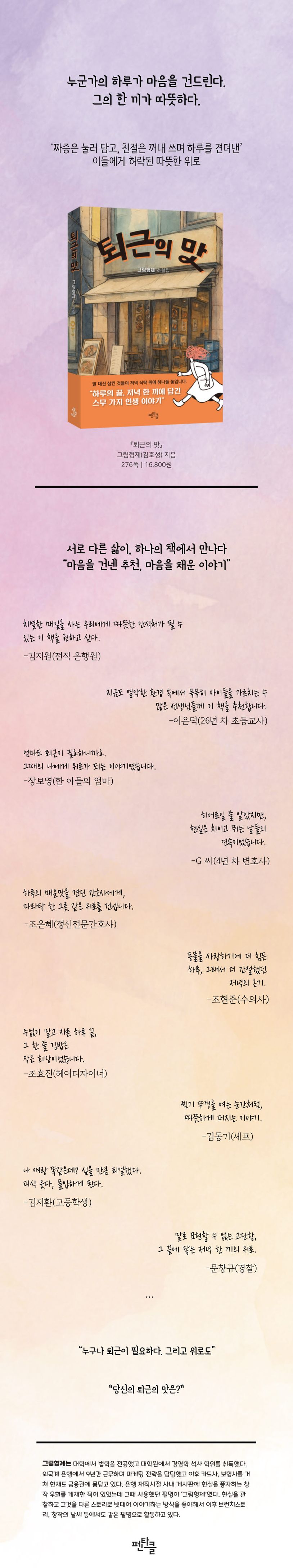 퇴근후마주한식탁에는단순한음식만있는것이아니다.그날의감정,풍경,피로,기쁨,실망,그리고아주짧은위로가함께놓여있다.『퇴근의맛』은20개의직업을가진인물들이퇴근후먹는한끼식사와그에얽힌감정을따라가는옴니버스픽션이다.하루를마무리하는저녁한끼를중심으로구성된이이야기들은브런치스토리연재당시부터“현실적이다”,“내얘기같다”,“밥한숟갈먹으며읽다가울컥했다”는독자반응을불러일으켰다.변호사,교사,수의사,군인,간호사,엄마,학생등누구나알지만자세히들여다본적없는직업인들의하루와내면을조용히응시하며,그끝자락에서건네는따뜻한말없는위로가큰감정의여운을남긴다.