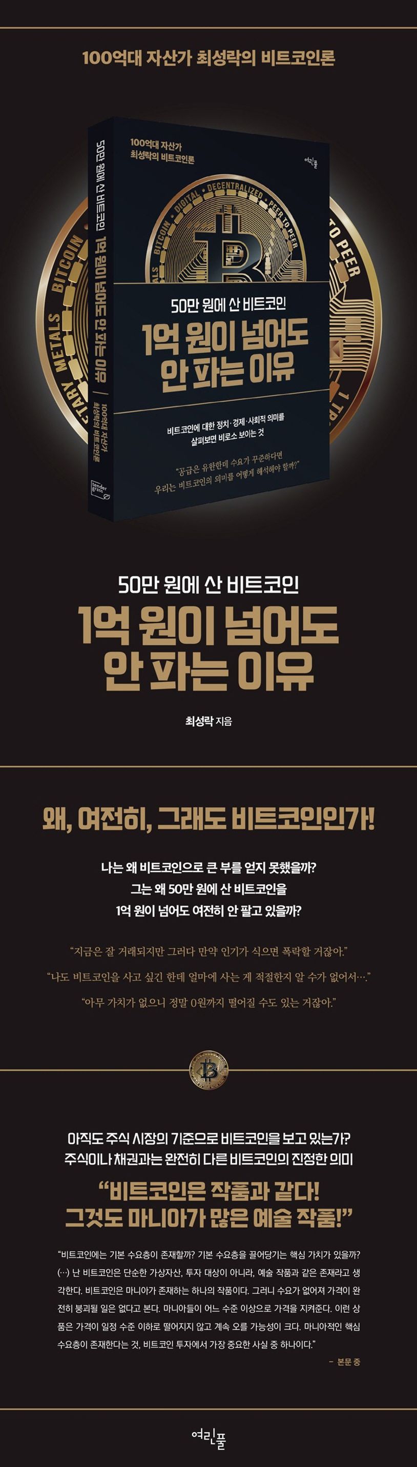 아직도주식시장의기준으로비트코인을해석하고있는가?주식이나채권과는완전히다른비트코인의진정한의미“비트코인은작품과같다!그것도마니아를거느린예술작품과같다!”신간《50만원에산비트코인1억원이넘어도안파는이유》(여린풀펴냄)에서저자최성락전교수는지난11년을롤러코스터를탄시간이었다고말한다.그사이수없이많았던10~20%수준의급등락은말할것도없고,평균1년8개월에한번씩총6차례에걸쳐일어난가격반토막사태까지견뎌내야했기때문이다.그럼에도저자는비트코인의가치에공감했고,그미래에대한믿음이있었다.그는이렇게말한다.“비트코인은작품과같다!그것도마니아를거느린예술작품과같다!”저자가11년간비트코인의롤러코스터같은여정을견딜수있었던것은,그것이단순한투자수단이아니라경제자유주의,인터넷독립주의,분권주의,세계정부주의,무정부주의등을아우르는‘혁명적상징’이었기때문이다.이상징성은전세계수많은이들의마음에불을지폈고,그들을비트코인의마니아로만들었다.그래서비트코인은예술작품과같은특성을갖게되었다.지난16년동안비트코인은그무정부주의적정체성덕분에열광적인팬층을확보할수있었지만동시에그로인해경제학자들(특히케인스주의자)의신랄한비판을받아야했고,세계각국정부로부터배척당해야했다.국가에의지하지않는독립적인대체화폐였기에‘국가의인정을받지못하는비트코인이화폐가될수있느냐?달러를대체하는기축통화가될수있느냐?’같은논쟁에휘말려야했으며,경제학계석학들로부터는곧사라질거라는‘사망선고’까지받아야했다.하지만2024년초미국에서비트코인ETF가승인되면서이제는화폐논쟁을넘어서서가상자산의대표주자로우뚝서게되었다.“지금은잘거래되지만그러다만약인기가식으면폭락할거잖아.”“나도비트코인을사고싶긴한데얼마에사는게적절한지알수가없어서….”“아무가치가없으니정말0원까지떨어질수도있는거잖아.”그럼에도왜,여전히비트코인인가!저자는말한다.“비트코인이태어난지15년이넘었다.그동안사람들은비트코인에대해여러이야기를듣고판단해왔다.하지만그대부분의판단은틀렸다.”그래서지난10년간비트코인의가격은2만%이상상승했지만,정작이기회를통해큰부를얻은사람은많지않다.“사회적으로든,기술적으로든,경제적으로든,투자적으로든비트코인에대한판단이맞았다면,그사람은지금최소한먹고살걱정은하지않는부자가되었을것이다.몇천원,몇만원하던것이지금1억원이넘었는데,이렇게오른종목이바로옆에있었는데부자가되지못했다는건말이안되지않은가.지금부자가되지못했다면비트코인에대한판단에오류가있었다는것을말해준다.”그래서저자는우리가왜비트코인에대한판단을반복해서틀려왔는지를돌아보자고말한다.그과정을통해자신의약점을파악하고,사고오류를수정할기회를가질수있기때문이다.그런점에서비트코인은‘우리자신을돌아보게하는거울’이다.책에서는비트코인의의미는물론,어떻게투자해야부로이어질수있는지에대해서도조언해준다.그동안그냥듣기만했거나일부말만듣고무시해왔다면,이제는한번쯤비트코인에대해스스로진지하게고민해볼시기이다.더늦기전에자신의생각과입장을점검해보자.그래야그결과와상관없이최소한후회는하지않을것이다.