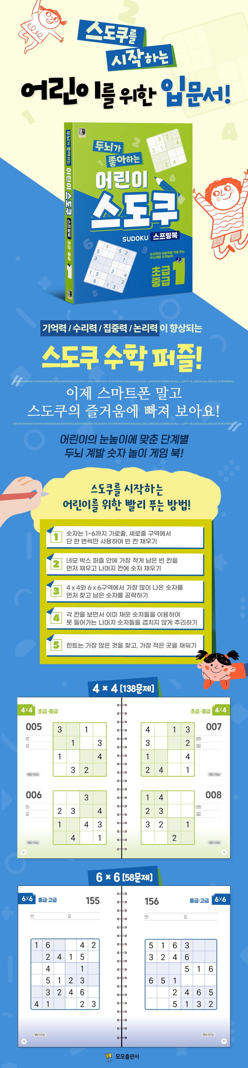 이 책은 저학년부터 고학년까지 어린이의 눈높이에 맞춰 난이도를 조절했습니다. 초급용으로 4×4 퍼즐(138문제), 중급용으로 6×6 퍼즐(58문제)을 준비했습니다. 책머리에는 스도쿠 퍼즐 푸는 방법을 친절하고 자세하게 소개하였고. 손동작이 미숙한 어린이들을 위해 퍼즐의 네모 칸을 넉넉하게 디자인하여 숫자를 썼다 지웠다 하는 어려움이 없습니다. 또한 스프링 제본으로 되어 있어 페이지를 넘기기 쉽고 손에 잡히는 작은 휴대용 사이즈로 만들어 장소에 상관없이 쉽게 가지고 다니기 좋습니다.