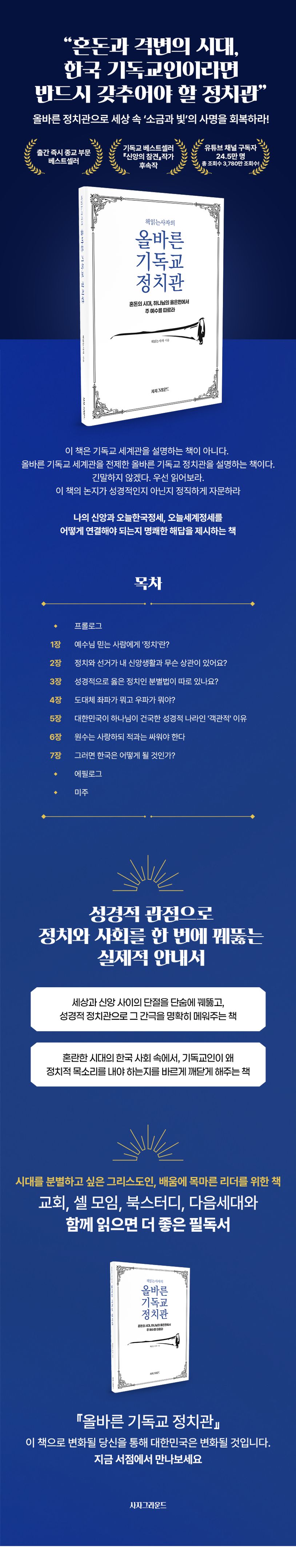 2025년, 대한민국은 정치적·사회적 대격변을 맞았다. 새 정부의 출범, 거대 여당 시대, 극심한 정당 분열과 전례 없는 혼란 속에서 한국교회와 기독교인은 폭풍을 머금은 하늘 아래 놓여 있다. 혼돈과 격변의 한가운데, 한국 기독교인들은 어떤 정치관을 가져야 하는가? 이것이 그리스도인이라는 정체성과 어떠한 관련이 있는가? 『올바른 기독교 정치관』은 바로 이 시대, 현실 속에서 하나님의 옳은편을 분별할 수 있는 중요한 준거점이 될 것이다.