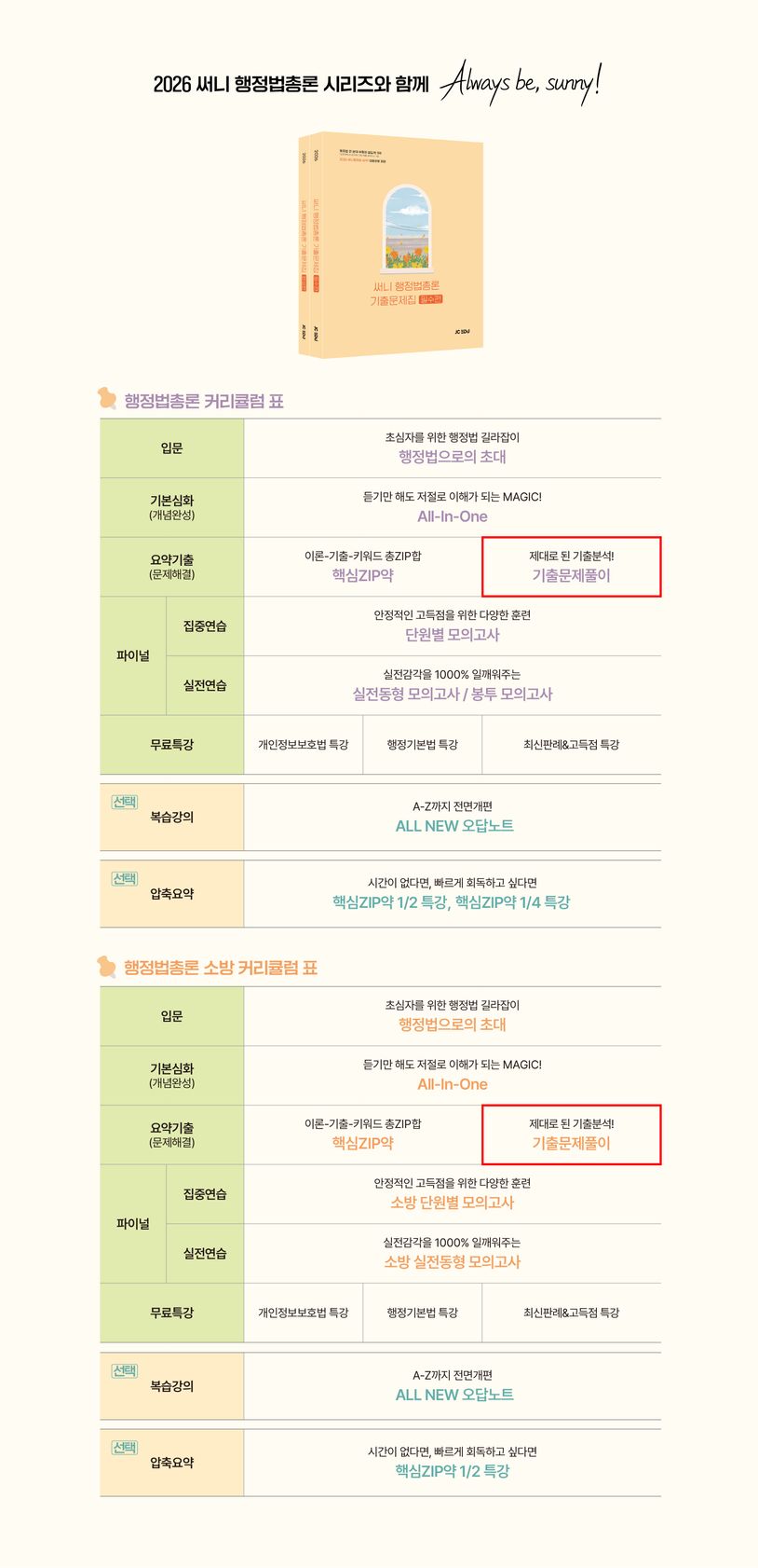 『2026 써니 행정법총론 기출문제집』에서는 기출문제를 분류하여 변화를 이끌었다. [필수편]은 인사혁신처, 소방직 9급, 군무원 7·9급 기출문제들로 구성하고, [완성편]은 소방간부, 경찰간부, 변호사, 국회직 8·9급 등 기출문제들로 구성하여 수험 적합도를 높였다.