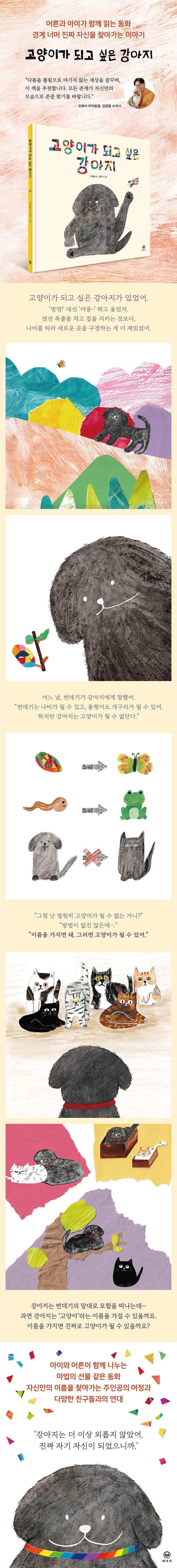 『고양이가 되고 싶은 강아지』는 자신만의 이름을 찾아 나서는 주인공의 여정과 그 길 위에서 만난 다양한 친구들과의 연대를 그린 동화입니다. 관습의 틀을 벗어난 이야기와 경계를 허무는 콜라주 기법이 어우러져, 주인공의 고민과 성장 과정을 생생하고 다채롭게 담아냅니다. 아이들은 물론 자기 자신을 찾고자 하는 어른들에게도 깊은 울림을 전하는 이 책은, 세상이 정해준 이름이 아닌 ‘진짜 나’의 이름으로 살아가고자 하는 모든 존재를 위한 응원의 메시지입니다.
