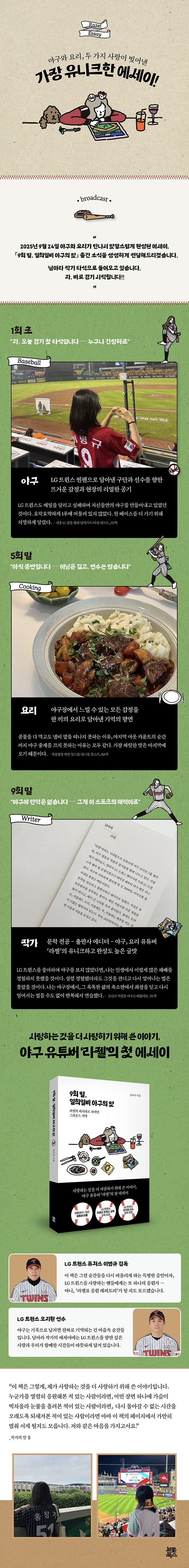 야구를 사랑하는 독자에게는 그라운드에서 느꼈던 생생한 감정이 글 속에서 되살아나는 경험이 될 것이고, 음식을 사랑하는 독자에게는 식탁 위의 맛을 통해 경기의 긴장과 환희를 새롭게 느낄 수 있는 기회가 될 것이다. 『9회 말, 일희일비 야구의 맛』은 결국 야구와 요리, 두 가지 세계가 만나 완성한 가장 유니크한 에세이로, 우리가 사랑하는 것을 오래도록 곱씹을 수 있는 ‘삶의 맛’을 선물한다.