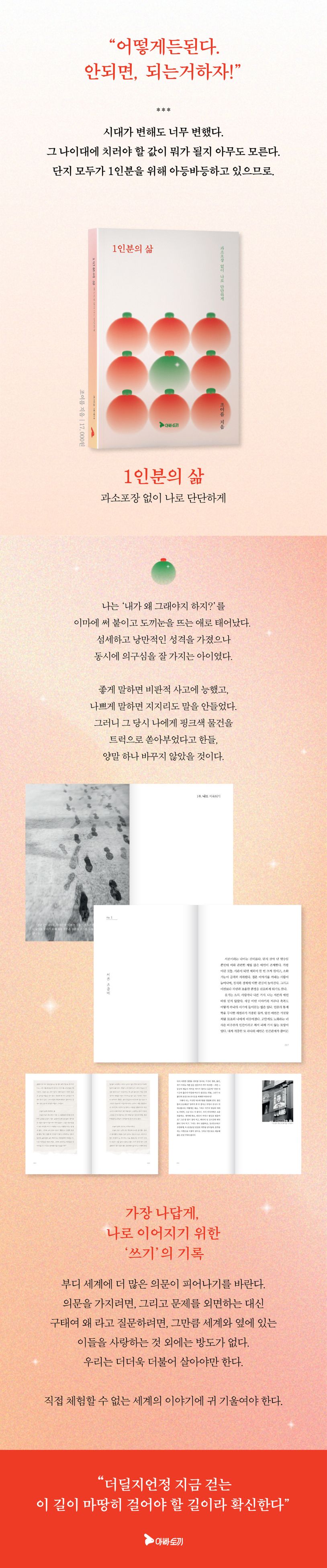 《1인분의 삶-과소포장 없이 나로 단단하게》는 이런 정량화된 1인분을 ‘나’를 중심으로 다시 정의한다. 20대를 지나, 30대에 접어들면서 삶은 다시 정의되기 시작한다. 나는 중학교 자퇴 투쟁을 하다가 실패하고 예술고에 들어가 기어코 자퇴를 쟁취한다. 그리고 이후 3년간 와식 생활에 돌입한다. 20살을 넘긴 뒤에야 다시 수능을 보고 대학에 들어가지만, 마지막 학기엔 올 F를 받고 휴학해 버린다. 이 과정을 평균의 시선으로 바라본다면 나는 비주류의 인간이 될 것이다. 하지만 나는 여전히 나로서 꿋꿋하게, 사회의 일원으로 살아가고 있다. 내 주변 사람들이, 내가 바라보는 세계가, 그리고 나를 둘러싼 일상은 나름대로 유쾌하고, 다정하다.