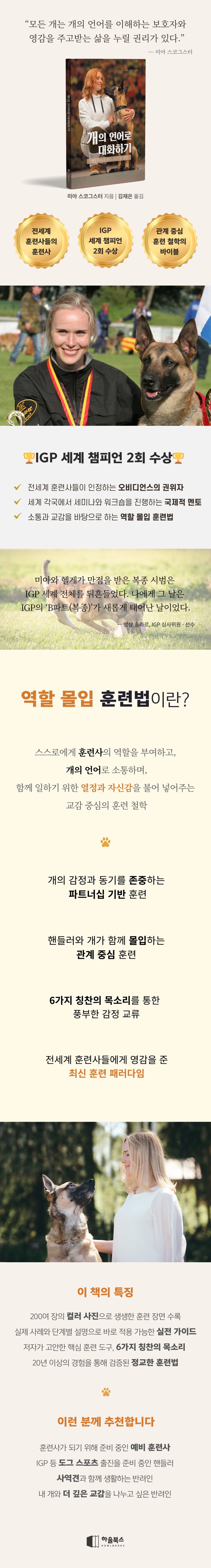 이 책은 예비 훈련사, IGP와 그 외 도그 스포츠 출진을 준비하는 핸들러, 사역견과 생활하는 반려인, 그리고 명령-복종을 넘어 ‘교감’에 기반을 둔 교육을 원하는 반려인을 위한 실전 길잡이가 되어줄 것이다. 개의 감정을 읽고, 적절한 방법으로 동기와 자신감을 부여하며, 나를 즐겁게 따르게 할 수 있다면 훈련은 그 자체로 ‘대화’가 된다.