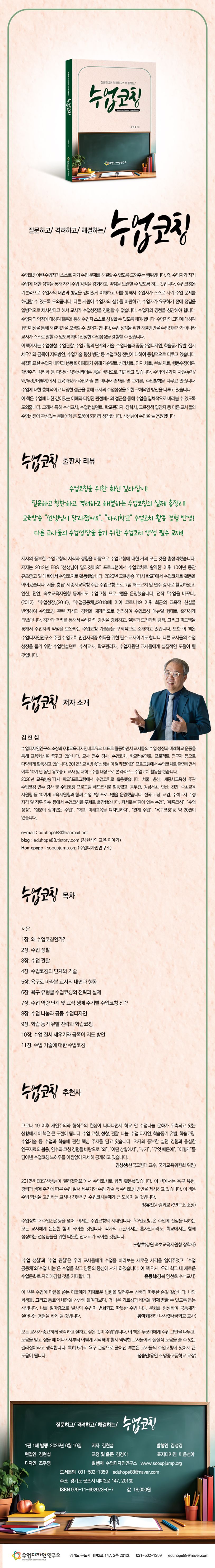 이 책에서는 수업성찰, 수업관찰, 수업코칭의 단계와 기술, 수업나눔과 공동수업디자인, 학습동기유발, 질서 세우기와 금쪽이 지도방안, 수업기술 향상 방안 등 수업코칭 전반에 대하여 종합적으로 다루고 있습니다. 복잡미묘한 수업자 내면과 행동을 이해하기 위해 게슈탈트 심리치료, 인지 치료, 현실 치료, 행동수정이론, 개인주의 심리학 등 다양한 상담심리이론 등을 바탕으로 접근하고 있습니다. 수업의 4가지 차원(누가/왜/무엇/어떻게)에서 교육과정과 수업기술 뿐 아니라 존재론 및 관계론, 수업철학을 다루고 있습니다. 수업에 대한 총체적이고 다양한 접근을 통해 교사의 수업성장을 위한 구체적인 방안을 다루고 있습니다.