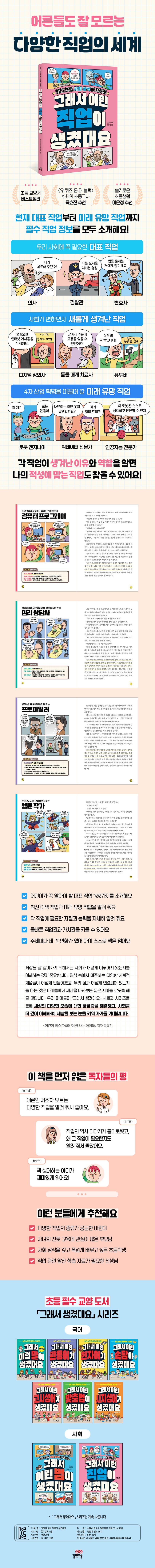 아이들은 “장래 희망이 뭐니?”라는 질문을 자주 받곤 해요. 대부분은 선생님, 경찰관, 연예인, 의사, 유튜버처럼 잘 알려진 몇몇 직업만을 이야기하지요. 하지만 세상에는 정말 많은 직업이 존재한답니다. 『그래서 이런 직업이 생겼대요』는 우리에게 익숙한 직업부터 최신 이색 직업, 미래 유망 직업까지 폭넓은 직업의 세계를 흥미로운 네 칸 만화와 짤막한 이야기로 쉽고 재미있게 가르쳐 주는 책이에요.