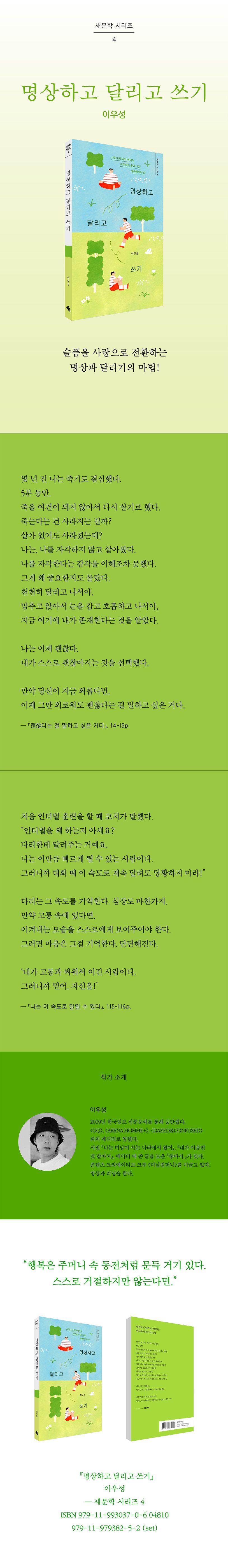 2009년한국일보신춘문예를통해등단했다.〈GQ〉〈ARENAHOMME+〉〈DAZED&CONFUSED〉피처에디터로일했다.시집『나는미남이사는나라에서왔어』『내가이유인것같아서』,에디터때쓴글을모은『좋아서,』가있다.콘텐츠크리에이티브크루〈미남컴퍼니〉를이끌고있다.명상과러닝을한다.
