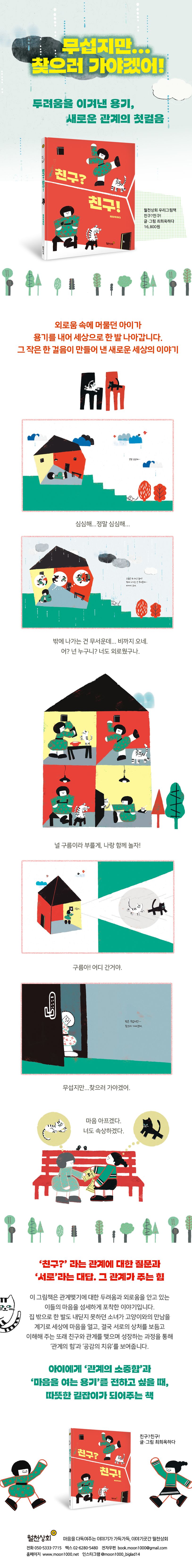 밖은무섭지만,찾으러가야겠어.겁이많은소녀는좀처럼집밖으로나서지못합니다.그저집안에서뒹굴뒹굴하며심심해하지요.비가오는어느날,창문을통해고양이한마리가찾아옵니다.뜻밖의손님이반가운소녀는간식을대접하지요.둘은함께춤추고TV를보며즐거운시간을보냅니다.이제소녀에게고양이는,이름을지어주고그이름을부를만큼커다란의미가됩니다.외로움을달래준고양이가소녀에게아주특별한존재가된것이지요.소녀는자신의특별한고양이에게나름대로의각별한관심과정성을쏟기시작합니다.나랑만놀기를,위험한밖에나가지않고함께집안에만머물기를,자신의생각대로고양이가따라주기를바라고원하기시작합니다.소녀가생각한그‘특별함’이관계를어렵게만든것일까요?급기야고양이는소녀의곁을떠나버리고맙니다.슬퍼하던소녀는자신의특별한관계를되찾고싶었습니다.커다란용기를내고,드디어문을나섭니다.집을나선소녀에게어떤세상이기다리고있을까요?소녀는자신의특별한친구를다시만날수있을까요?‘친구?’라는관계에대한질문과‘서로’라는대답.그관계가주는힘.우리는수많은관계속에서살아갑니다.‘나’가‘너’를발견하고‘우리’로확장되는과정인친구사귀기는곧세상과의관계맺기의시작입니다.그런데잘지내던친구끼리도틀어지고다시안볼것처럼싸우는것을보면,관계를유지하고발전시키는것도관계맺기못지않게중요한일임에틀림없습니다.최희옥하다작가의새그림책〈친구?친구!〉는주인공소녀와고양이를따라가며‘관계’에대한질문과그에대한대답을찾습니다.소녀에게고양이는처음으로다가와빈곳을채워준친구였고구원이었는지모릅니다.그런고양이에게소녀는나름의방식으로친밀함과애착을표현하지만고양이는소녀를떠나고말지요.그것은소녀의방식이었을뿐,고양이가원한것은아니었기때문입니다.소녀는특별한그관계를되찾기위해용기를냅니다.그런소녀가문밖으로나서새로운친구를만나깨닫게된것은’서로’라는대답이었습니다.서로의상처를이해하고,마음을내어주는법이었던것입니다.그렇게서로를이해하고보듬을때관계는비로소완성되고깊이를더할것이라는사실,바로그것말입니다.최희옥하다작가는간결하고세련된그림을통해용기내어타인에게손내밀어보자고,그러면그연결과관계로부터자신을발견하고지탱하는새로운힘을얻을수있을것이라고이야기합니다.작가의바램처럼이책이관계에서어려움을겪고있는이들의마음에조금이나마치유와성장의계기가되기를,나아가관계맺기에기꺼이손내밀수있는용기와힘을보탤수있기를기대해봅니다.