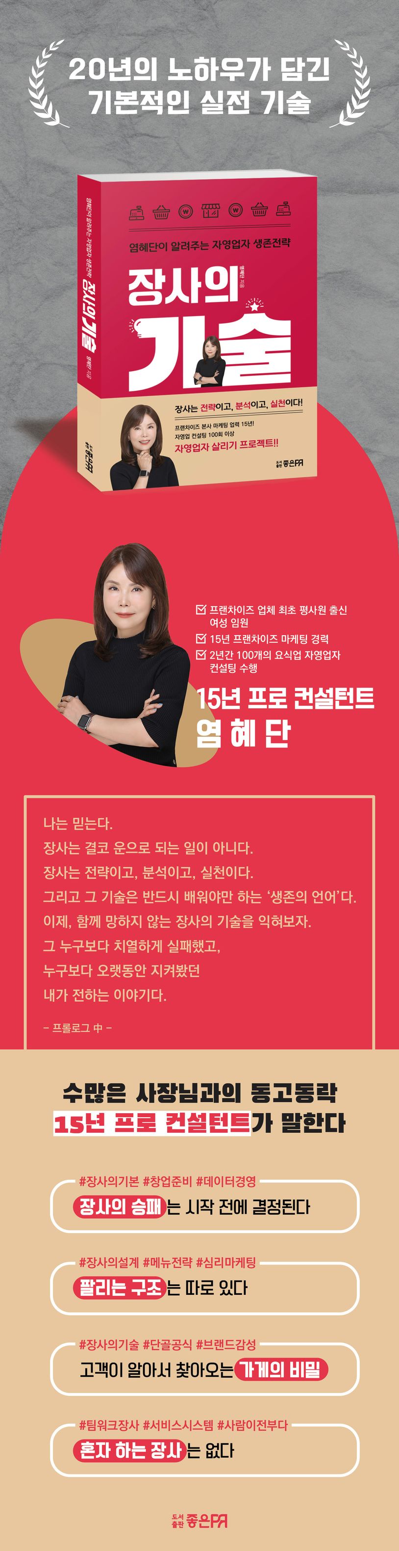 『장사의 기술』은 20년간 외식업 최전선에서 수많은 자영업자들의 흥망성쇠를 지켜본 저자 염혜단이 전하는 살아남는 장사의 전략서입니다. 저자 역시 초보 창업자로 시작해 고깃집 폐업이라는 쓰라린 경험을 겪고, 이후 프랜차이즈 본사에서 실전 마케팅과 가맹점 관리 전반을 총괄하며 성장해 왔습니다.