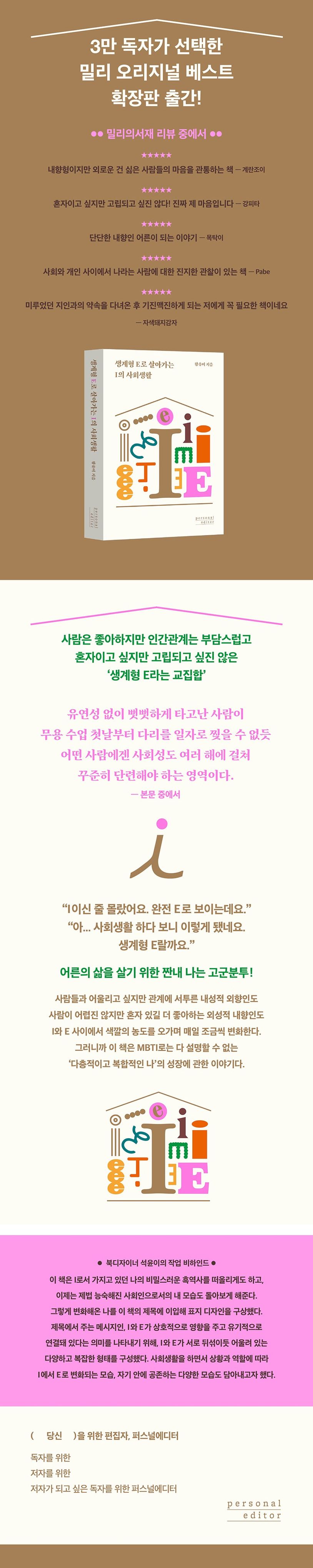 태초에I가있었다.먹고사느라이런저런일을겪고,이사람저사람과부대끼다보면사회인으로서의매너와스킬이점차숙련된다.이른바후천적E,생계형E로진화하게되는것이다.아니,나원래되게낯가리는데?나원래말수없는데?아무도믿어주지않는마음속항변은생계형E로살아가는이땅의I들이‘어른의삶을살기위해’그동안얼마나짠내나는고군분투를해왔는지고스란히보여준다.