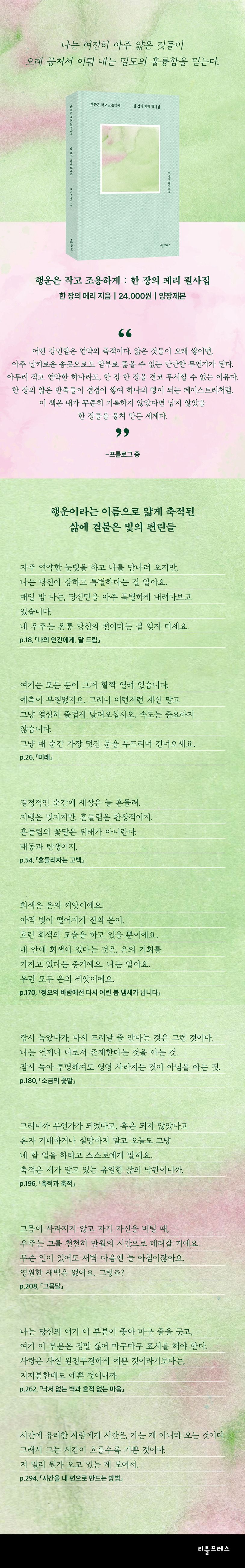 《행운은 작고 조용하게》는 유튜브 크리에이터 ‘한 장의 페리’가 일상의 수많은 장면 너머로 담아온 순간들을 조용한 결로 담아낸 문장들을 모아 놓은 필사집이다. 조용한 감성의 브이로그 〈한 장의 페리〉와 글 메일링 서비스 〈한 장의 생각〉으로 많은 이들의 일상에 위로를 건네온 저자가, 그동안 발행해 온 원고들 중 추리고 모아 손으로 써내려가는 위로의 시간을 제안한다. 작고 조용한 문장 하나가 마음 어딘가에 오래 머무를 수 있기를 바라며. 눈부신 한 장의 축적이 더 나은 다음을 만들 수 있기를 바라며. 나를 충만하게 만드는 얇고 작은 축적들이 차곡차곡 쌓여가길 바라며.