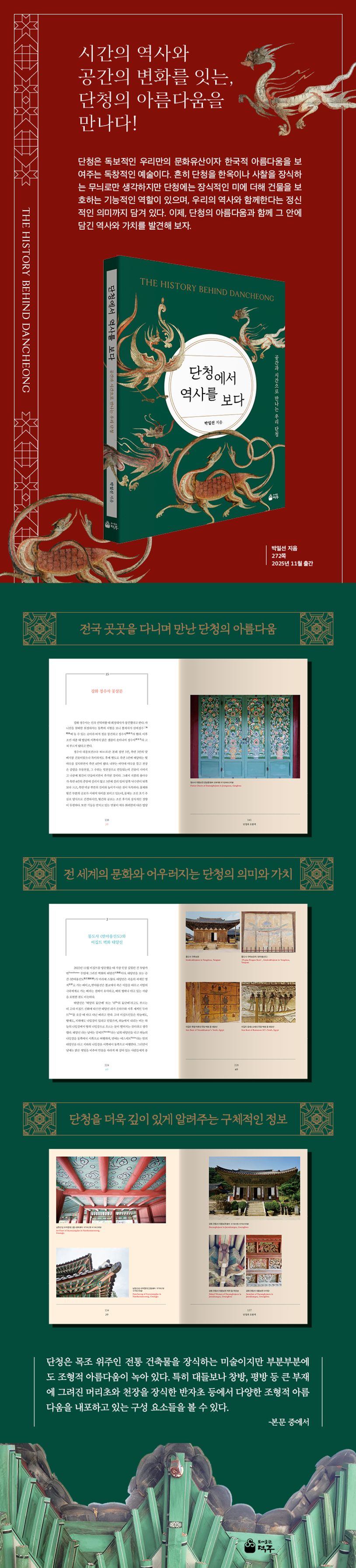 프롤로그단청인연1부예술로서의단청1단청은매우현대적이다2단청과회화,단청은회화인가?3단청과회화의융합,단청산수화4단청과불화,민화5인상주의단청,희정당6미니멀리즘단청,종묘7〈일월오봉도〉와관우,동묘8수덕사벽화와살아있는문화재,임천9단청과아라베스크,테셀레이션2부단청과오방색1단청의역사2단청과오방색3단청의종류,가칠단청과긋기단청4단청의종류,모로단청과금단청5단청의곱팽이문양과박생광6단청의태극문양7수미단의단청8천장단청,반자초9문살단청,꽃살문10궁창단청,궁창초11사신도,사령단청12천장빗반자에그려진비천13수어장대와태평화14강화전등사수미단과귀면15강화정수사꽃살문16단청에그려진무지개,휘17단청에그려진과일,석류18단청의낙은동과버선19탑골공원팔각정과소식단청20궁궐의천장단청에그려진봉황3부역사와함께보는단청1세종로기념비전앞에서단청을생각하다2소공동환구단터에서단청을생각하다3나주금성관에서단청을생각하다4나주향교에서단청을생각하다5나주불회사에서단청을생각하다6나주죽림사에서단청을생각하다7고종의서재,집옥재에서단청을생각하다8창덕궁흥복헌에서단청을생각하다9파주보광사에서단청을생각하다10선운사만세루에서단청을생각하다11대한성공회강화성당에서단청을생각하다4부해외에서찾아본단청데자뷰1단청과이즈니크타일,아줄레주타일2통도사〈반야용선도〉와이집트벽화태양선3〈쌍봉황도〉와캄보디아바이욘사원4대적사거인벽화와스페인성크리스토퍼벽화5단청과아르메니아하치카르,양피지필사본6단청의초엽무늬와구스타프클림트7단청의칠보문과벤츠엠블럼8단청의주의초와커튼9〈운룡도〉와성게오르그평론박일선의회화고충환