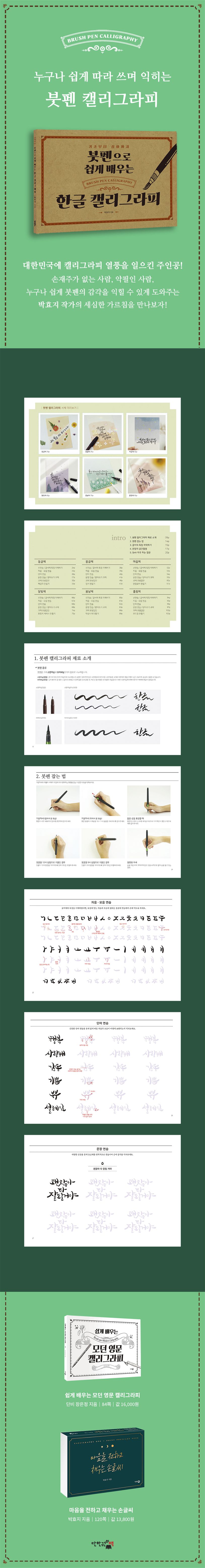 『붓펜으로 쉽게 배우는 한글 캘리그라피』는 붓펜에 최적화된 서체를 만들어서 누구나 쉽게 써볼 수 있는 것에 초점이 맞추어져 있는 책입니다.
