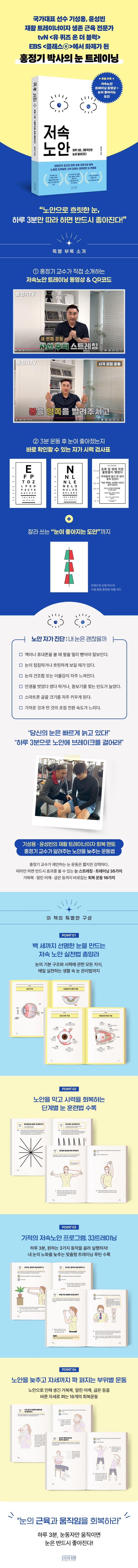 운동은짧고정확해야한다.무엇보다꾸준히할수있어야효과를기대할수있다.일상속에서부담없이,틈틈이반복할수있어야한다.잠깐의휴식시간,책상앞,대중교통안,스마트폰을내려놓은바로그순간등아무데서나,언제든지실천가능한루틴이필요하다.《저속노안》은3-3프로그램을기본으로진행한다.‘무리하지않는운동’이야말로눈건강의핵심이라는원칙을지키며,누구나따라할수있는현실적이면서도과학적인루틴으로,단순하고구조적으로설계했다.방법은간단하다.한번에3동작,하루3분만투자하면된다.이짧은루틴은눈의긴장을부드럽게풀고일상에부담없이녹아들수있는리듬을만들어준다.무엇보다중요한건일관성이다.짧고간단한동작을매일규칙적으로반복하는습관이야말로노안을늦추는데실질적인차이를만든다.