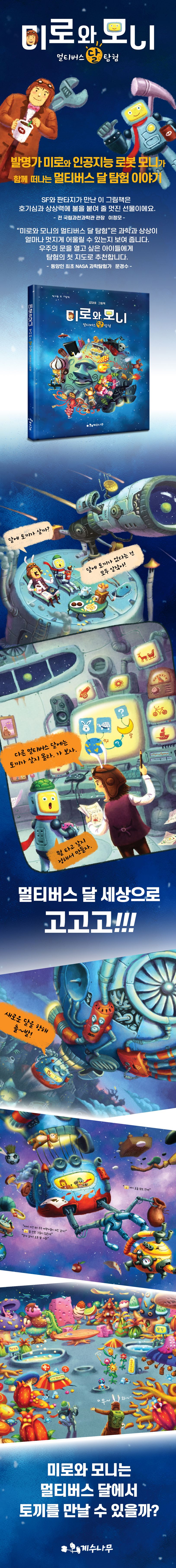 옛 사람들은 ‘달에 토끼가 산다’고 믿었지만, 아폴로 11호 달 탐험으로 달에는 생명체가 없음이 밝혀졌지요. 미로와 모니는 다른 차원의 멀티버스 달 탐험을 결정합니다. 이 여행은 상상에서 출발합니다. 초광속 차원 이동 열기구를 만들어 차원문을 통과하면서 멀티버스 달에 도착합니다. 미로와 모니가 도착한 멀티버스 달에는 치즈가 열리는 나무와 과자나무가 있고, 분화구 온천과 다양한 모습의 생명체도 있었습니다. 그런데 거대한 괴물 ‘토북이’가 삼만 년 만에 잠에서 깨어나는 바람에 여행의 위기가 찾아옵니다. 미로와 모니는 비상 탈출선 분리에 성공하여 집으로 돌아옵니다. 하지만 또 다른 우주에 살고 있는 미로2, 모니2가 새로운 여행을 시작합니다.