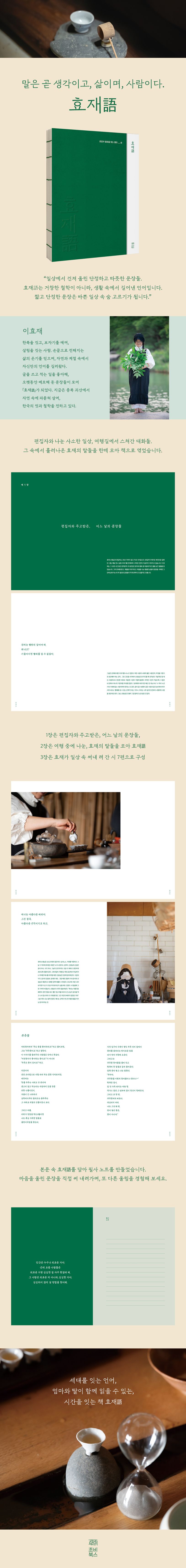 특히 각 장의 문장에 덧붙은 ‘효재의 기록’은 단순한 메모를 넘어 저자의 삶의 철학과 경험이 스며든 이야기로 채워졌다. 자연과 더불어 살아가는 삶의 태도, 한국적 아름다움에 대한 통찰, 일상 속에서 발견하는 기쁨과 위로까지, 글 사이사이에 담긴 저자의 생각은 읽는 이들에게 작은 쉼표가 되어준다.