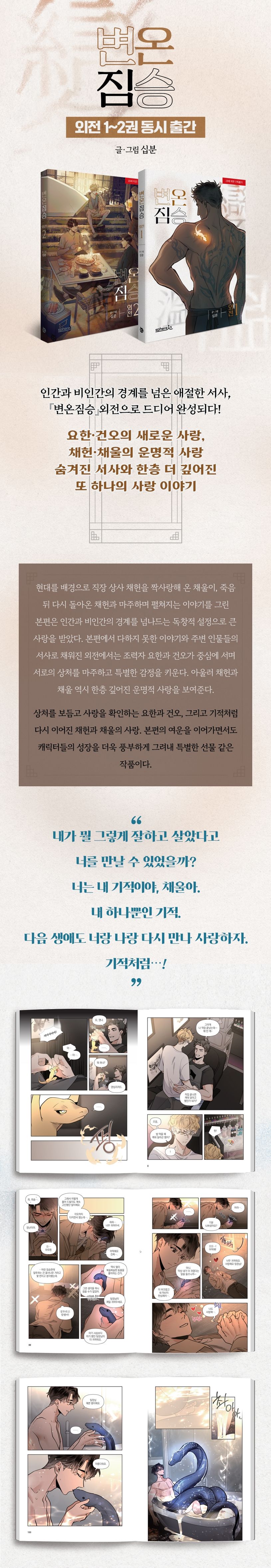 십분 작가의 『변온짐승』시리즈 외전 1, 2권이 출간되었다. 현대를 배경으로 독특한 설정과 깊이 있는 서사를 선보이며 큰 사랑을 받아온 십분 작가의 웹툰 《변온짐승》이 외전편까지 완결되며 독자들의 성원에 보답했다.