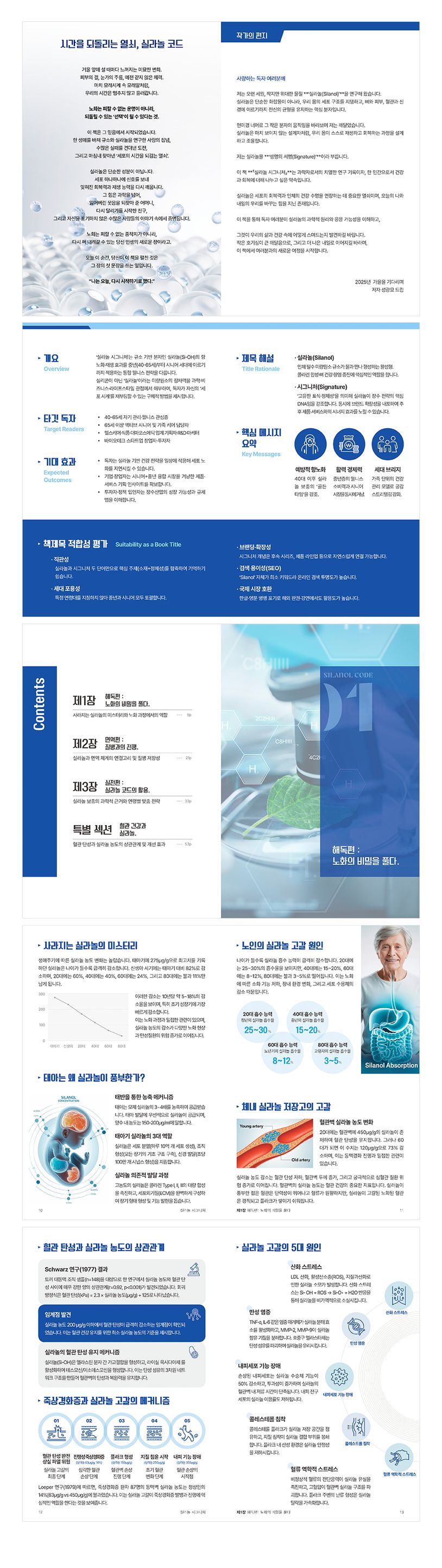생로병사의 과정은 생물이라면 거역할 수 없는 절대적인 흐름이다. 하지만 인류는 좀 더 오래, 건강하게 살기 위해서 생로병사의 비밀을 끊임없이 탐구해 왔다. 이 책 『실라놀 코드』는 태아 때는 우리 몸에 풍부하지만 노화와 함께 점차 사라지는 물질 ‘실라놀’에 초점을 맞춰 생로병사의 비밀에 인체의 미량원소인 ‘실라놀’이 깊이 개입하고 있다는 주장을 골자로 한다. 책은 사라지는 실라놀의 미스터리와 노화 과정에서의 역할, 실라놀과 우리 몸의 면역체제의 연결고리, 실라놀 보충의 과학적 근거와 연령별 맞춤 전략, 혈관 탄성과 실라놀 농도의 상관관계 및 개선 효과를 이야기한다.