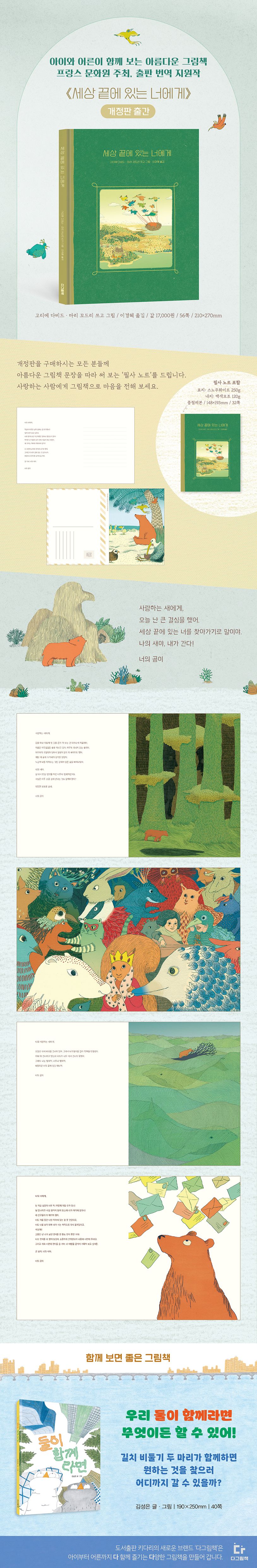 《세상 끝에 있는 너에게》는 사랑으로 가득 찬 편지글과 깊은 인상을 남기는 이미지가 어우러진 그림책입니다. 그 아름다움을 인정받아 프랑스 문화원 출판 번역 지원 프로그램에 선정되었으며, 2018년 출간 이후 많은 독자들의 사랑을 받아 왔습니다. 2025년 개정판에는 표지 이미지, 본문 서체, 인쇄지가 새롭게 바뀌었습니다.