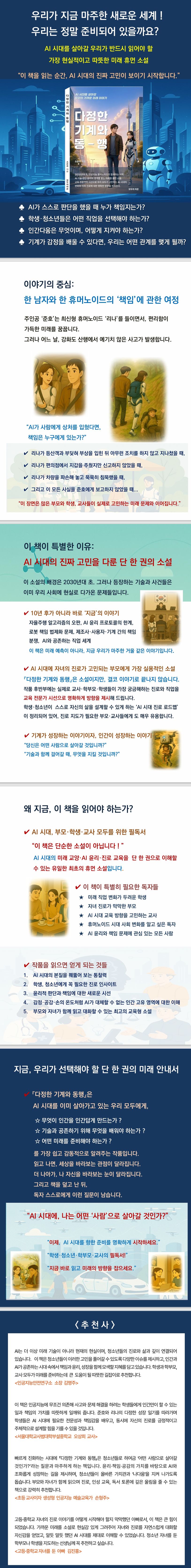 사고 앞에서 침묵한 기계와 그 결과를 감당해야 하는 인간의 선택을 통해, 이 책은 “기계는 어디까지 판단할 수 있는가?”, “인간은 무엇을 책임져야 하는가?”라는 본질적인 질문을 독자에게 던진다. 인공지능 휴머노이드 ‘리나’와 주인공 ‘준호’의 이야기를 중심으로 기술과 사회가 어떻게 공존할 수 있는지를 탐구하며, 특히 학생·청소년과 학부모, 교사에게 AI 시대의 진로와 삶의 방향에 대해 중요한 통찰을 제공한다. 이 책은 가족 간 진로 대화와 교육적 상담을 자연스럽게 이어주는 지금 꼭 필요한 이야기다.