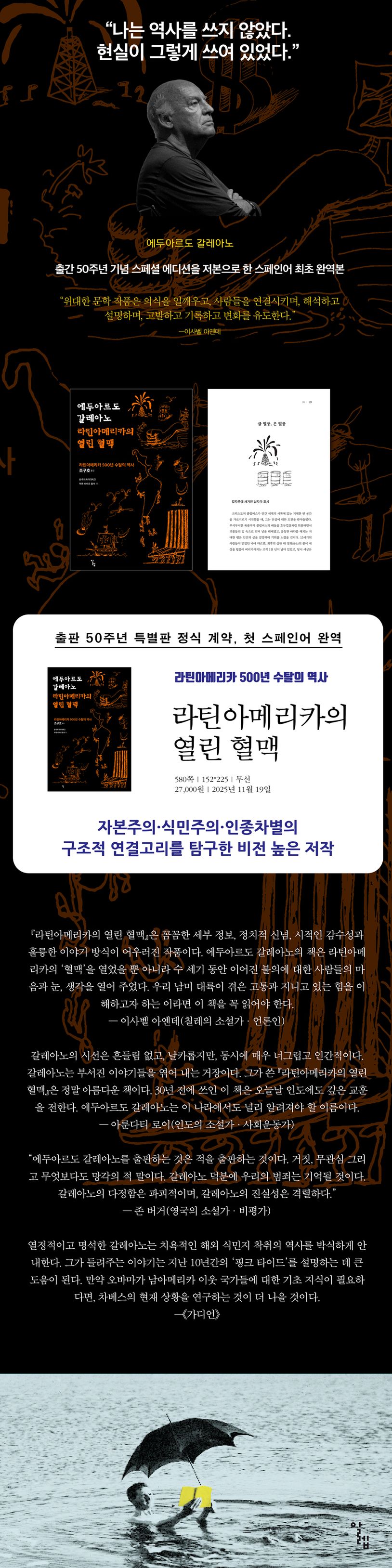 갈레아노는수탈의역사에서도아이티혁명,원주민봉기,노동자파업등민중의저항과연대가끊임없이이어져왔음을강조한다.오늘날신자유주의와디지털자본주의라는새로운형태로착취구조가지속되는상황에서,이책은세계경제의불평등을성찰하게하는유효한거울로기능한다.