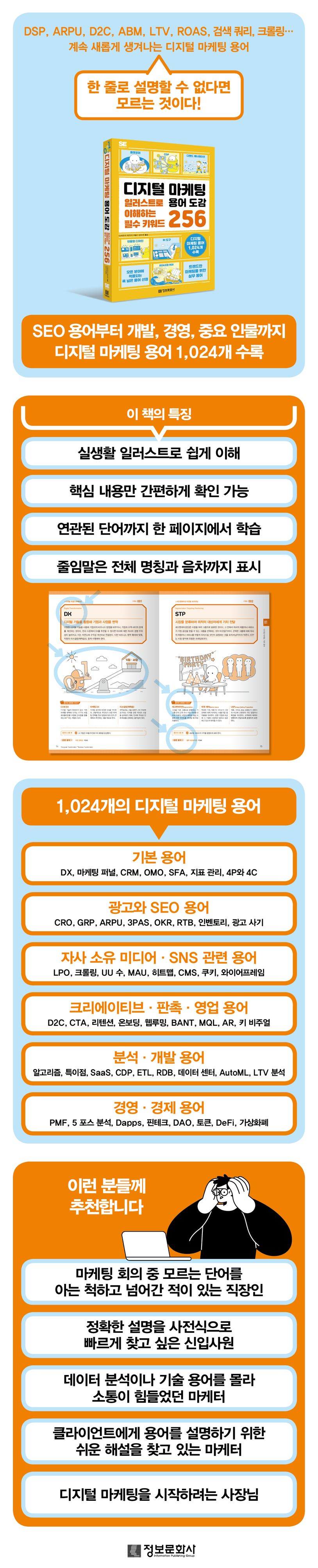 이 책은 디지털 마케팅이란 어렴풋한 개념을 누구든 이해할 수 있도록 하기 위해 사전식으로 구성되어 있다. 256개의 용어는 디지털 마케팅 기본 용어, 광고와 SEO 용어, 미디어·SNS 용어, 크리에이티브·판촉·영업 용어, 분석·개발 용어, 경영·경제 용어와 중요 인물로 7장으로 분류되어, 독자가 언제든 필요한 부분만 찾아 리스킬링할 수 있다. 약어가 많은 용어의 특징을 고려해 256개 용어의 전체 명칭과 음차를 항상 표시하고, 한 줄 정의와 자세한 설명이 있다. 또한 해당 용어와 관련 있는 용어를 3개씩 추가로 배치해, 총 1,024개의 디지털 마케팅 용어를 배울 수 있게 했다. 뿐만 아니라 모든 주요 용어를 나타내는 실생활 밀접 일러스트가 함께 있어 디지털 마케팅이 처음인 사람도, 디지털 마케팅 용어를 후배나 클라이언트에게 쉽게 설명해야 하는 사람도 수월하게 내용을 활용할 수 있게 했다.
