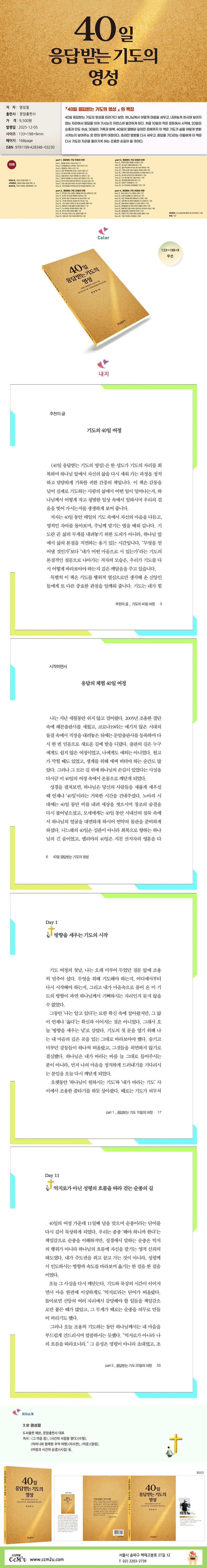 40일 응답받는 기도의 영성을 따라가다 보면, 하나님께서 어떻게 마음을 세우고, 내려놓게 하시며 보이지 않는 자리에서 응답을 이어 가시는지 자연스레 발견하게 된다. 처음 10일의 작은 정돈에서 시작해, 20일의 순종과 인도 하심, 30일의 기록과 회복, 40일의 열매와 깊어진 은혜까지 이 책은 기도가 삶을 어떻게 변화시키는지 보여주는 한 편의 영적 여정이다. 흐려진 방향을 다시 세우고, 응답을 기다리는 이들에게 이 책은 다시 기도의 자리로 돌아가게 하는 조용한 손길이 될 것이다.