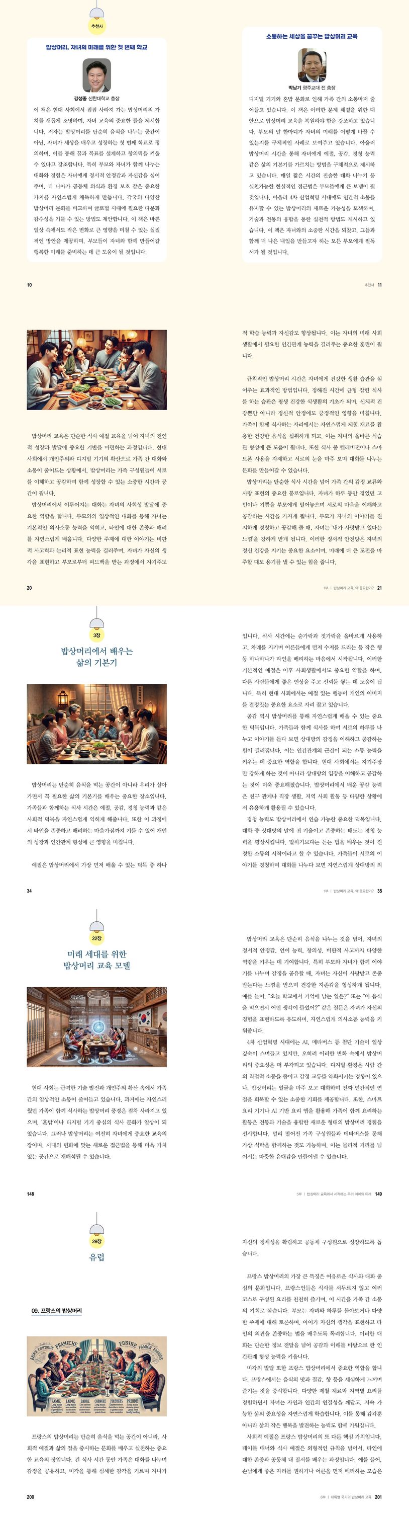 이러한 현실 속에서 도서출판 행복에너지의 신간 『밥상머리 교육에서 시작하는 우리 아이의 미래』는 가족과 함께하는 식사자리에서의 자연스러운 가정교육과 부모자식 간 소통의 중요성을 환기하는 동시에 전통적인 ‘밥상머리 자녀교육’과 다문화 사회, AI 시대 등의 현대적 키워드를 결합하여 자녀의 미래를 넘어 우리 사회 전체의 변화를 이끌어낼 수 있는 방법을 제안한다.