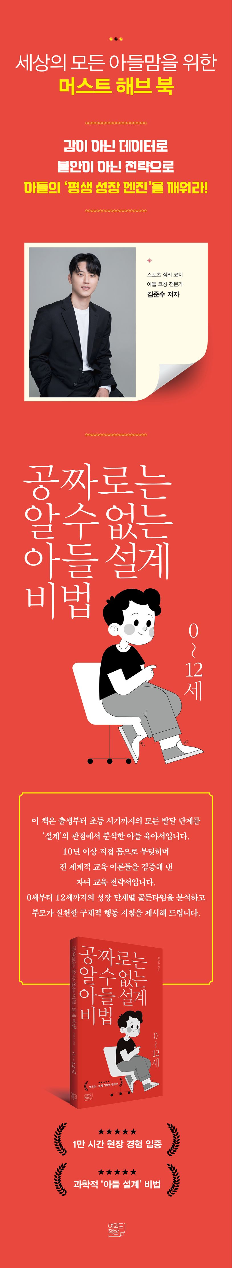 세상의 모든 엄마 역할은 어렵지만, 유독 아들 엄마들이 가야 할 양육의 길은 험난하다. 아들은 태어날 때부터 이성인 데다 엄마와 신체적, 정서적으로 다른 구조를 타고난다. 여러 가지 이유로 아들 교육은 늘 탐구해야 하는 대상이다. 『공짜로는 알 수 없는 아들 설계 비법 0~12세』는 아들 코칭 전문가가 10년의 현장 경험을 통해 출생부터 초등 시기까지의 모든 발달 단계를 ‘설계’의 관점에서 분석해 낸 책이다. ‘아들의 성장에는 과학이 필요하다’는 전제를 바탕으로 저자가 직접 몸으로 부딪히며 이론을 검증해 낸 실전 육아 전략서다. 이 책은 0세부터 12세까지의 성장 단계별 골든타임을 분석하고 부모가 실천할 구체적 행동 지침을 제시한다.