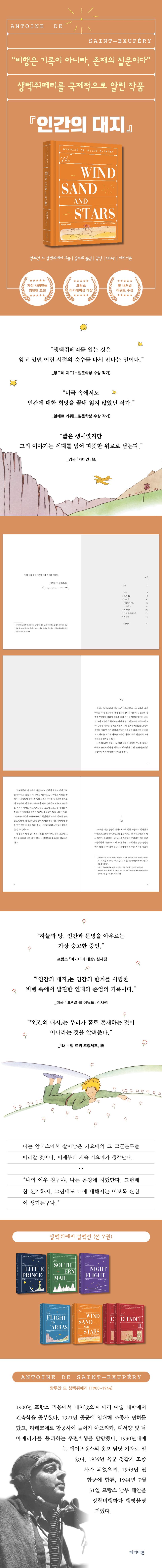 《인간의 대지》(Terre des hommes, 1939)는 앙투안 드 생텍쥐페리가 비행사로서 겪은 실제 경험을 토대로 쓰인, 그의 사상과 문학 세계가 가장 잘 드러나는 작품이다. 그는 사막에 추락해 죽음을 마주한 순간, 안데스 산맥을 넘나드는 위험한 비행, 동료 조종사와 정비사들의 희생 등을 통해 인간 존재의 본질을 성찰한다. 단순한 항공 기록을 넘어, 인간이 타인과 더불어 살아가는 연대와 책임, 그리고 문명과 인간성의 의미를 탐구한다. 생텍쥐페리는 하늘에서 바라본 지구와 인간을 시적이고 철학적인 언어로 묘사하며, 눈부신 자연의 아름다움과 그 앞에서 나약하면서도 숭고한 인간의 모습을 대비시킨다. 이 작품은 프랑스 아카데미 대상을 수상했으며, 생텍쥐페리를 세계적인 작가로 확고히 자리매김하게 했다.