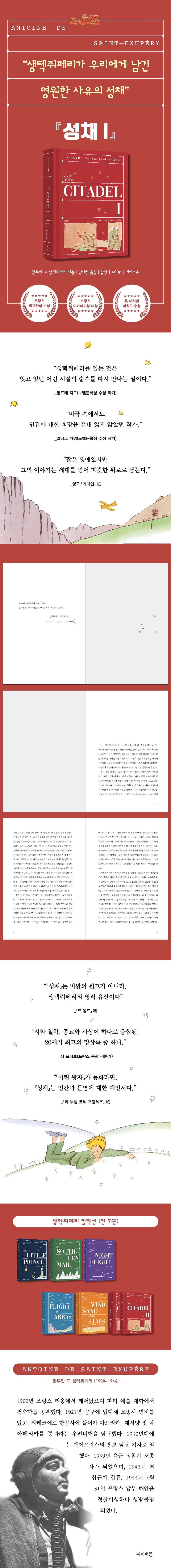《성채》(Citadelle, 1948)는 앙투안 드 생텍쥐페리가 생전에 집필했으나 미완으로 남은 원고를 바탕으로 사후 출간된 작품이다. 그의 사상과 문학적 성찰이 집대성된 저작으로 평가받는다. 소설의 형태를 띠기보다는 철학적·시적 산문에 가까우며, 가상의 사막 왕국 군주의 목소리를 통해 인간 존재와 공동체, 책임, 신앙, 사랑의 의미를 탐구한다. 이야기는 한 왕이 자신의 아들에게 남기는 교훈과 명상으로 전개되며, 인간 사회가 어떻게 유지되고 발전해야 하는가에 대한 깊은 사유가 담겨 있다. 생텍쥐페리는 비행사로서 경험한 고독과 죽음의 실존적 체험을 바탕으로, 인간이 서로를 통해 완성되는 존재라는 메시지를 강조한다. 《성채》는 《어린 왕자》, 《인간의 대지》와 더불어 그의 문학 세계를 완성하는 작품으로, 생텍쥐페리가 남긴 정신적 유산의 정수를 보여준다.