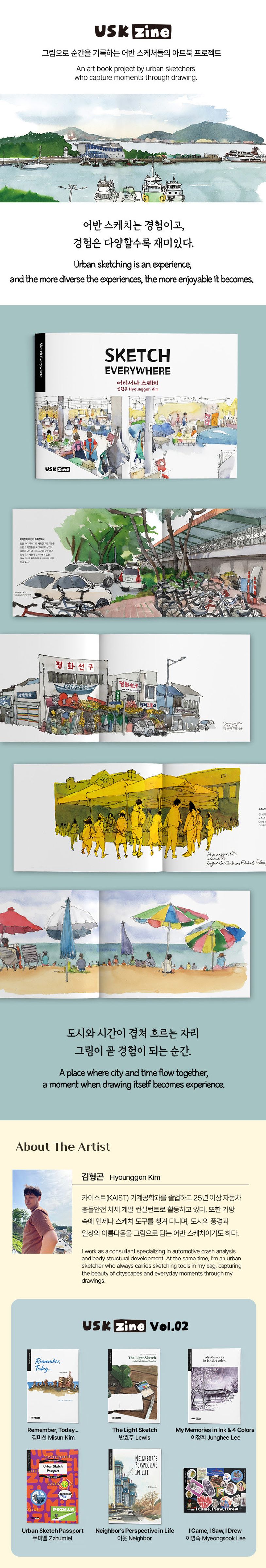 김형곤 작가의 두 번째 아트북은 도시와 일상의 순간들을 스케치로 기록한 작품집이다. 그는 늘 가방 속에 펜과 팔레트를 챙기며 멈춘 자리마다 그림을 시작하는 어반 스케처로, 지금-여기의 경험을 선과 색으로 붙잡아 왔다. “어반 스케치는 경험이다”라는 그의 말처럼, 이 책의 그림은 단순한 풍경 묘사를 넘어 살아 있는 순간의 감각을 전한다. 변전소와 지하철역, 캠핑장과 다리 밑, 낯선 출장지의 거리까지, 다양한 장소에서 완성된 드로잉은 현실과 감정이 겹쳐 흐르는 자리에서 빛난다. 독자는 이 장면들을 따라가며 도시와 사람, 그리고 일상을 바라보는 새로운 시선을 경험하게 된다.