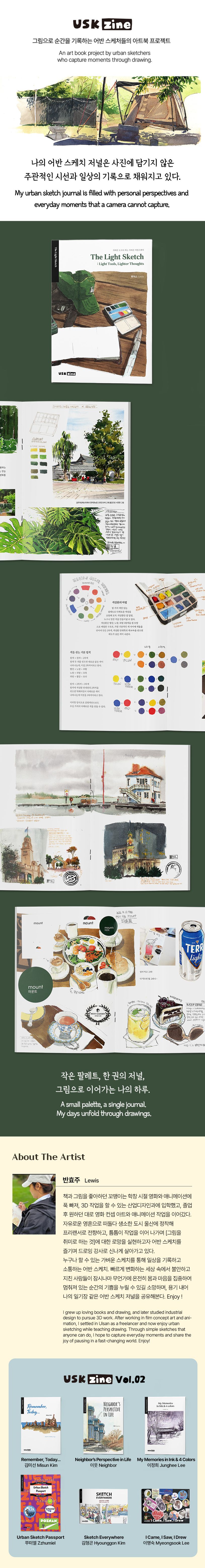 『The Light Sketch』는 잘 그린 그림을 가르치는 책이 아니다. 그보다는 누구나 손에 잡히는 도구로 가볍게 시작할 수 있는 드로잉의 즐거움을 이야기한다. 작은 선 하나, 빠른 스케치 한 장이 일상에 불어넣는 생기를 전하며, 그림을 통해 “더 가볍게 살아가는 법”을 독자들에게 건넨다.