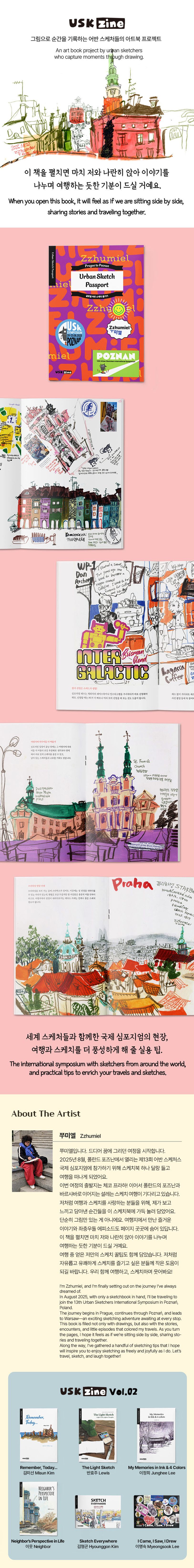이 책은 단순한 여행 기록을 넘어, 세계 각국의 스케처들과 교류하며 얻은 생생한 경험과 현장에서 체득한 스케치 팁을 함께 전한다. 건물, 풍경, 사람, 그리고 일상의 작은 장면들을 감각적인 구도와 즉흥적인 선으로 풀어낸 페이지들은 쭈미엘 특유의 경쾌한 시선이 드러나는 시각적 기록이다.