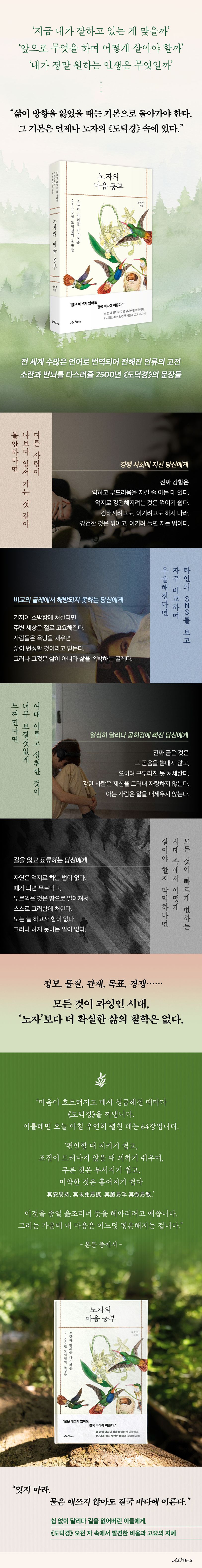 이 책 《노자의 마음 공부》는 《도덕경》 81장 가운데 현대인에게 가장 울림을 줄 34장을 선별해 각 장의 핵심 사상을 짚고, 오늘의 현실에 저자의 해석을 연결해 풀어냈다. 명문장가로 꼽히는 문학평론가이자 십수 년간 틈날 때마다 노자 사상을 공부하며 평온을 회복했다고 말하는 저자 장석주는 “삶이 방향을 잃었을 때는 기본으로 돌아가야 하며, 그 기본은 언제나 노자의 《도덕경》 속에 있다”라고 말한다. 저자의 문장을 통해 고전의 난해한 문구가 내 삶의 언어로 바뀌는 순간, 우리는 ‘노자’라는 오래된 목소리 속에서 여전히 유효한 지혜를 발견하게 될 것이다.