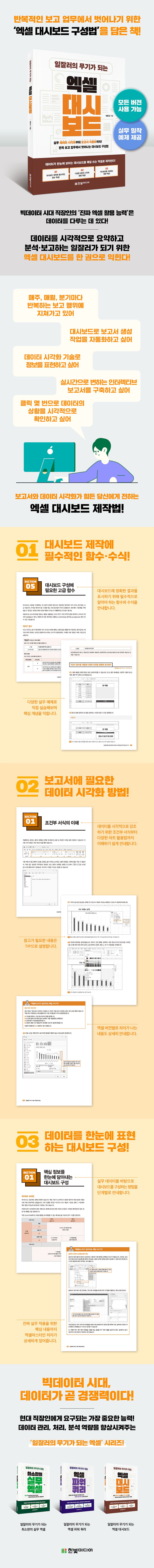 이 책은 대시보드를 Power BI 같은 전문 분석 프로그램이 아닌, 직장인들이 매일 쓰는 엑셀로 구성하는 방법을 알려준다. 엑셀로 대시보드를 사용하는 이유부터 정확한 대시보드 제작을 위해 필수적인 함수와 수식, 다양한 데이터 시각화 방법, 단계별 대시보드 구성법까지 체계적으로 배울 수 있다.