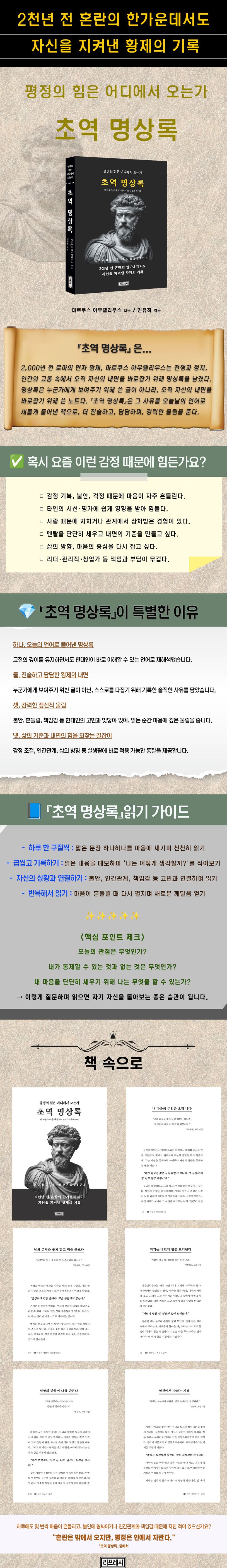 아우렐리우스가 남긴 이 정신은 지금 흔들리는 일상을 살아가는 우리에게도 실질적 지침이 된다. 감정에 휩쓸리지 않고, 외부의 말에 흔들리지 않으며, 스스로의 기준을 잃지 않기 위한 마음의 훈련. 『초역 명상록』은 그 훈련을 위한 가장 가까운 철학적 동반자다.