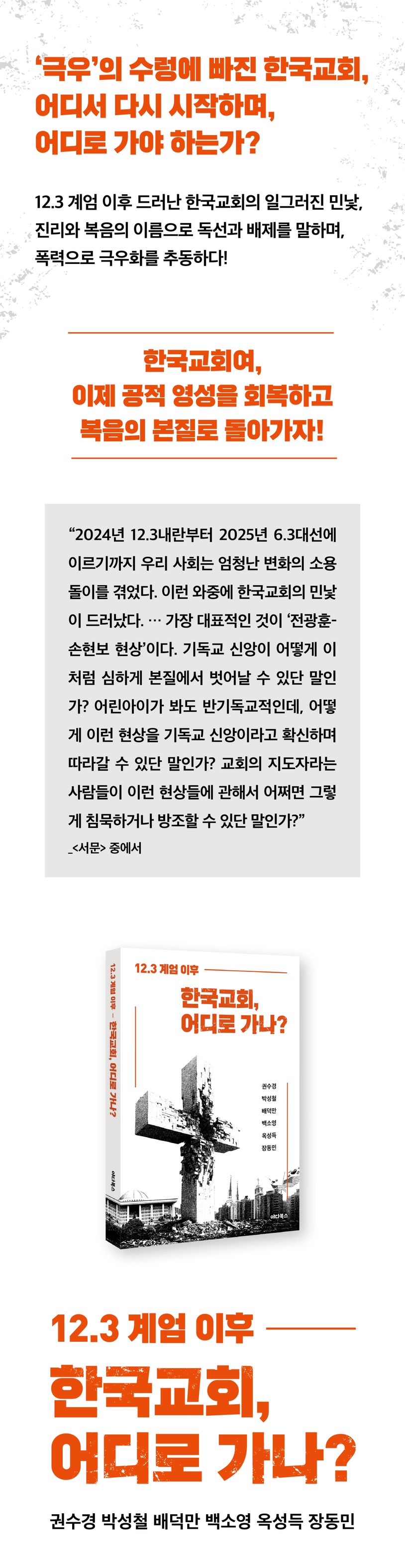 이 책은 단순한 한국교회 비판서가 아니다. 그보다 ‘12.3 계엄 이후’라는 한국사회의 중요한 ‘사건적’ 변화 앞에서 한국교회 또한 새로운 ‘사건적’ 변화를 시작해야 한다고 성찰과 실천을 촉구하는 사랑의 외침이다. 교회는 세상의 걱정거리가 아니라, 소금과 빛으로서 세상의 희망이 되어야 한다. 한국교회는 한국교회를 사랑하는 독자라면, 이 책의 외침 앞에서 잠시 멈추게 될 것이다. 그리고 그 멈춤이 한국교회의 새로운 출발점이 될 것이다.