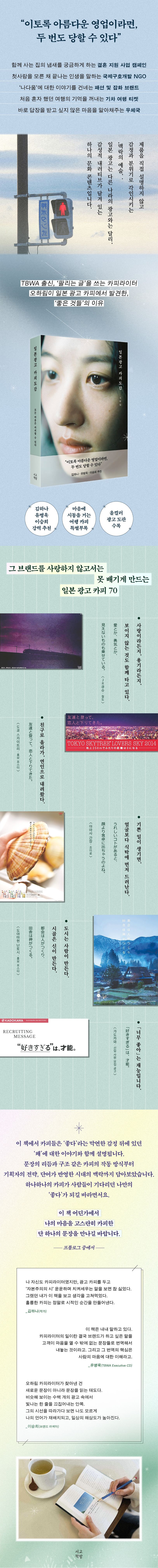 저자가 직접 선별한 일본 광고 카피 명문장은 단순히 해당 브랜드에 관한 흥미를 넘어 일상에서 차마 표현하지 못하고, 이름 붙이지 못했던 마음들을 가장 세련된 표현으로 정의해준다. 평범한 단어가 모여 만들어낸 평범하지 않은 카피들을 자신만의 시선으로 하나하나 흩어내고 생각을 덧입혀 적어낸 에세이는 영감이 필요할 때마다 길이 되어줄 것이다.